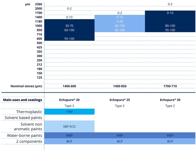 The Echopure® range exists in various particle sizes and multiple surface treatments (SBP ECO, SBP, WBP, TRM, BCP ) are available to enhance flotation, embedment and adhesion and to prevent agglomeration. The type of surface treatment depends on the type and thickness of the marking material.