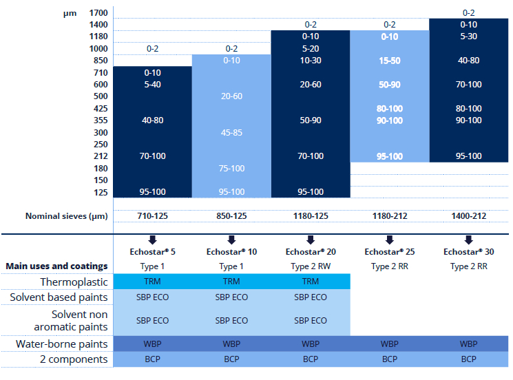 The Echostar® range exists in various particle sizes and multiple surface treatments (SBP ECO, SBP, WBP, TRM, BCP ) are available to enhance flotation, embedment and adhesion and to prevent agglomeration. The type of surface treatment depends on the type and thickness of the marking material.